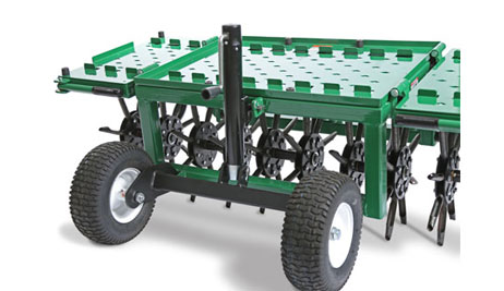 Self-propelled w/intuitive forward and reverse controls. Blade design reduces thatch. 11 blade slicing reel increases seed to soil contact and improves germination rates.